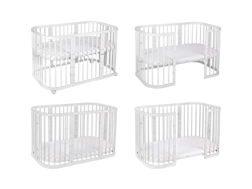 Patul poate fi folosit în 7 moduri: pat suplimentar, pat mic cu masă de schimbat, pat mai mare, pat mai mare cu intrare laterală, țarc, țarc cu intrare laterală, scaune cu masă.