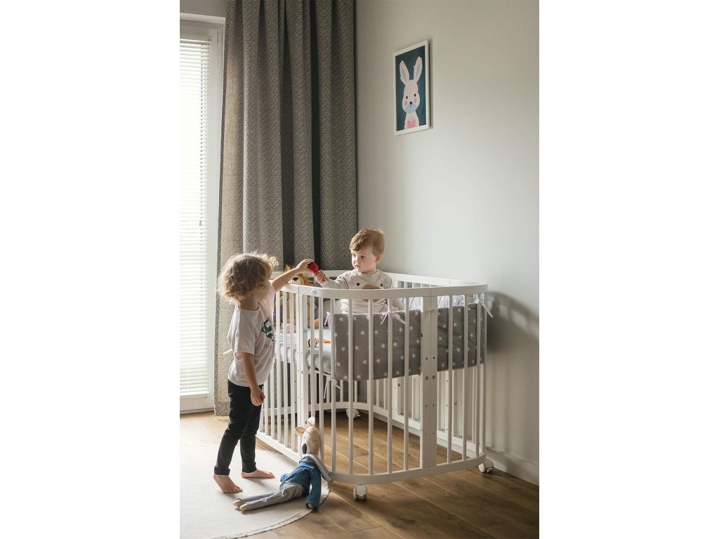 Patul pentru copii 7 în 1 în culoarea albă preferată este cu adevărat multifuncțional și va face parte din casa dumneavoastră pentru câțiva ani. Cea mai mică piesă este patul suplimentar pentru bebeluș, pe care îl puteți pune chiar lângă patul matrimonial și fixa cu o curea de siguranță specială pentru a nu se mișca. Până la 6 luni ale copilului, puteți folosi și dimensiunea mai mică a patului pe roți cu masă de schimbat. Roțile au frână de siguranță. Când deblocați patul, îl puteți manevra ușor și muta în sufragerie sau bucătărie. Patul pentru copii este disponibil în mai multe culori.