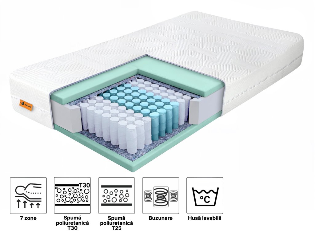 Compoziția materialului: Fetru, arcuri multipocket, spumă poliuretanică cu densitate de 25 kg/m3, spumă poliuretanică cu densitate de 30 kg/m3 Husă