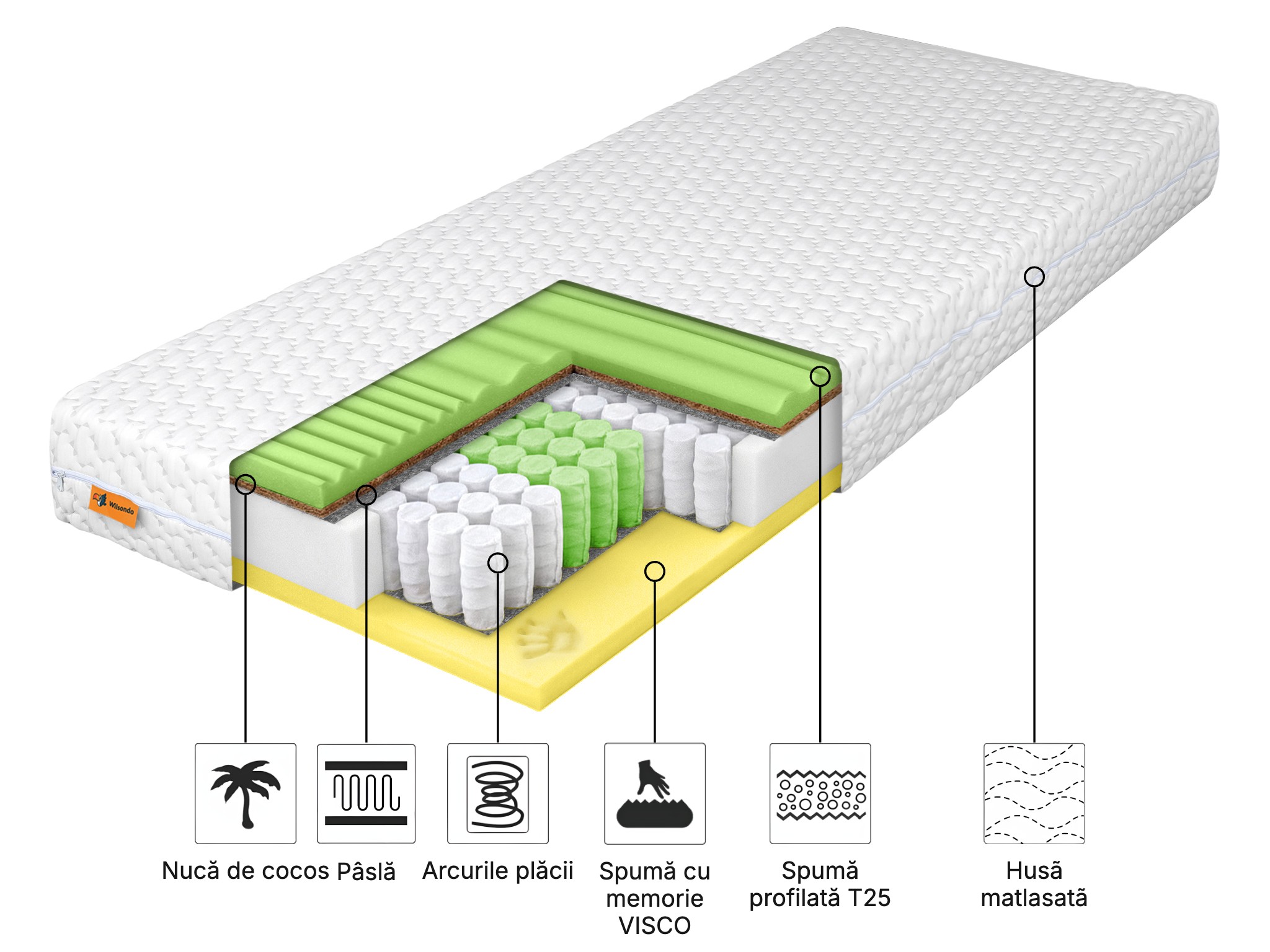 Compoziția materialului: arcuri tip pocket (7 zone), strat de pâslă, placă de nucă de cocos 1 cm, spumă poliuretanică T25, spumă cu memorie visco
