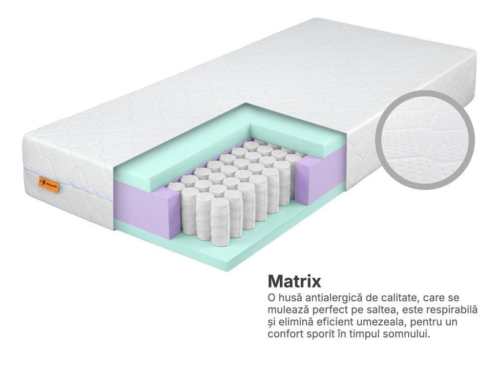 Salteaua este echipată cu o husă antialergică MATRIX, care este ușor elastică, se așază perfect pe saltea și asigură o circulație optimă a aerului. Husa este detasabilă și lavabilă până la 40 °C, ceea ce facilitează întreținerea și asigură un somn igienic. Materialul husei are certificare OEKO-TEX Standard 100.